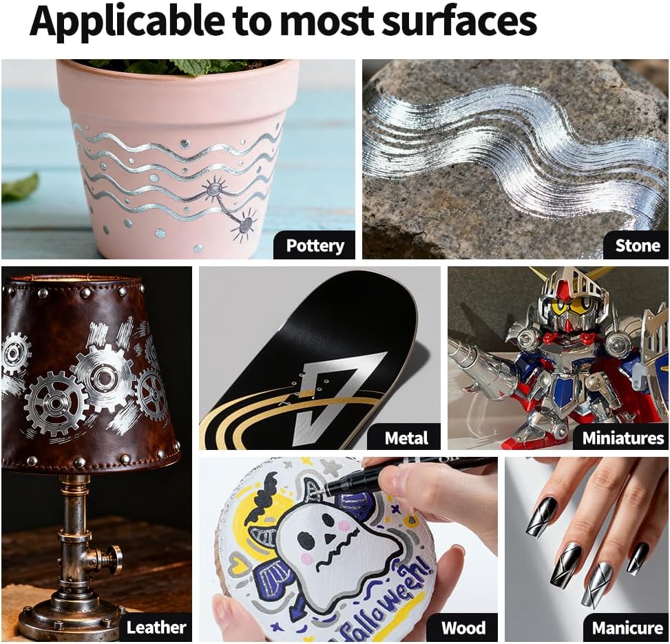 - These chrome paint pens are versatile, they are ideal for highlighting and decorative works. For art projects, they work on most surfaces, like post card, glasses, leather, metal, plastic, rocks, etc. They are also perfect for models, miniatures, giving them highlighting and mirror effects.