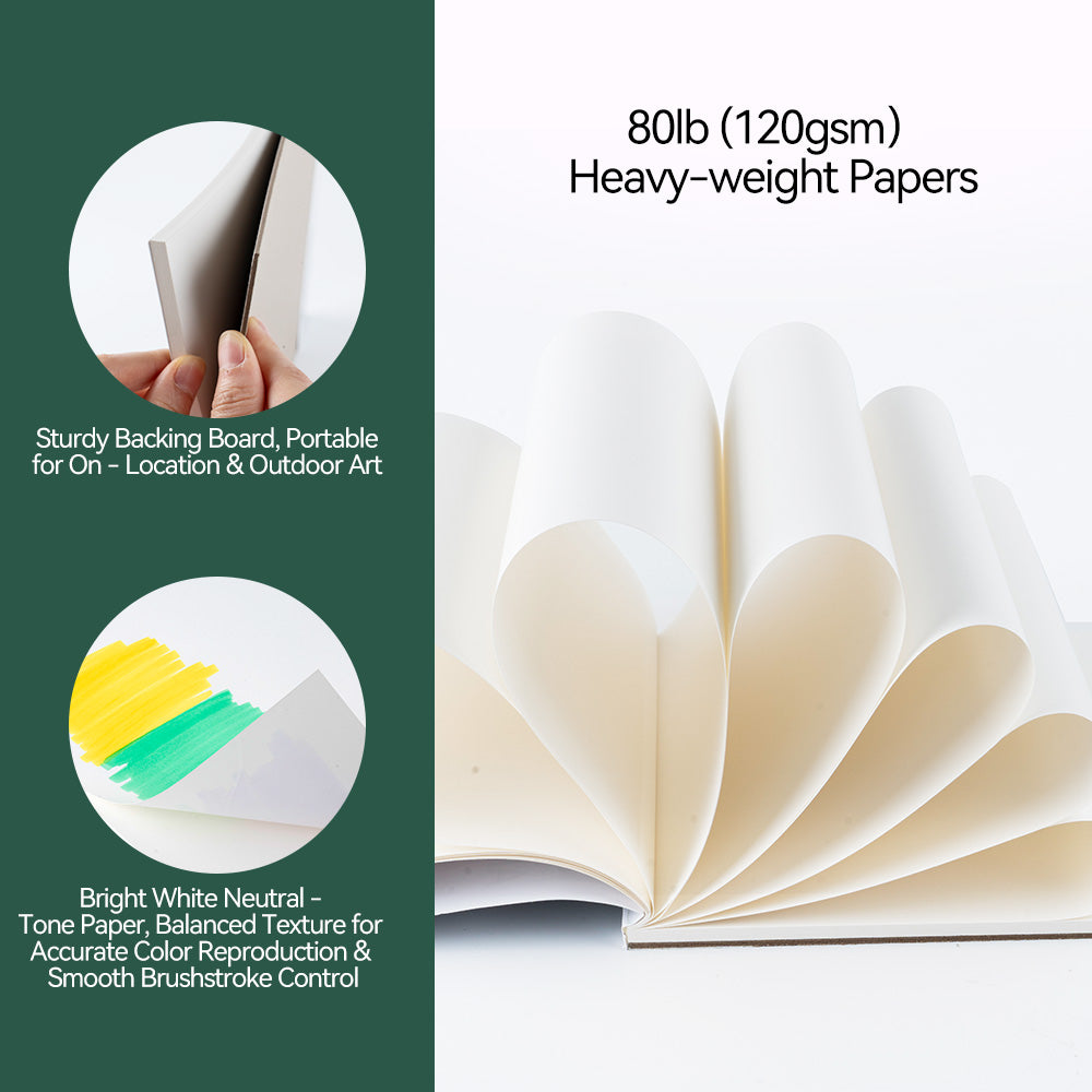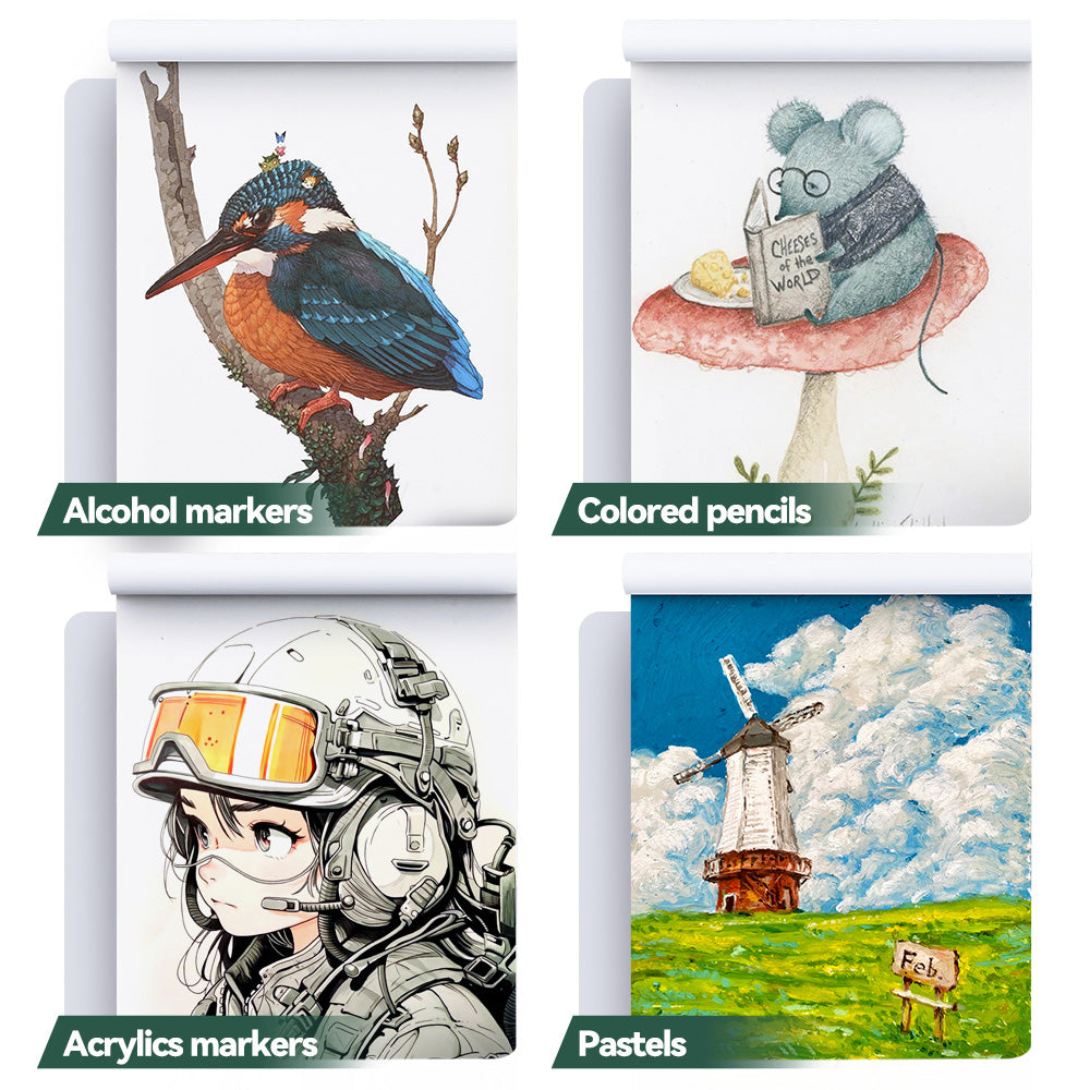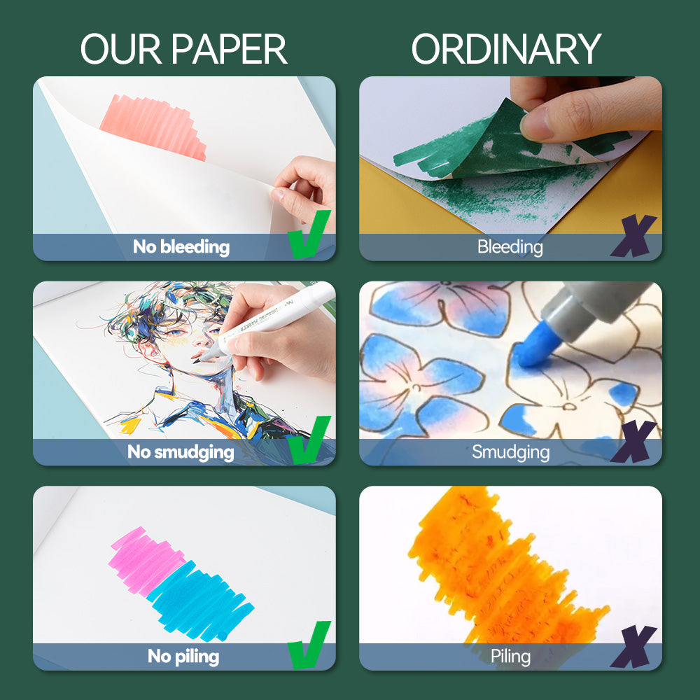 • This pad is versatile, suitable for different medium, support alcohol markers, acrylics markers, watercolors, gouache, inks, pencils and pastels, etc.
