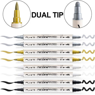 • This dual tip acrylic paint marker set includes: 6 black paint pens and 2 white paint pens. Dual felt tips: one end with 0.7-1mm(approx.) fine tip, the other end with 3-5mm(approx.) bold tip.